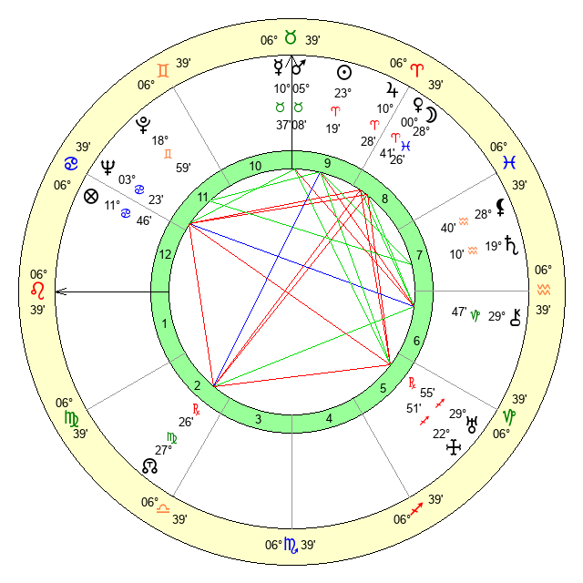 | Venus | 0 Aries 42 | 24 Pisces 39 | 29 Leo 18 |