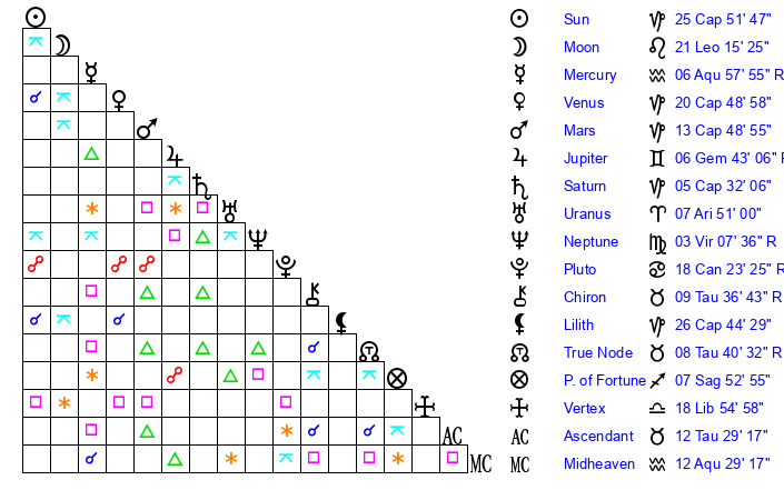 | Venus | 20 Capricorn 49 | 13 Pisces 50 | 19 Taurus 12 |