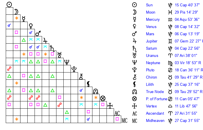 | Saturn | 4 Capricorn 40 | 14 Pisces 55 | 12 Capricorn 5 |
