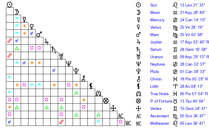 | Sun | 13 Leo 21 | 14 Leo 29 | 2 Sagittarius 36 |