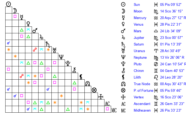 | Sun | 5 Pisces 10 | 6 Pisces 20 | 3 Gemini 32 |