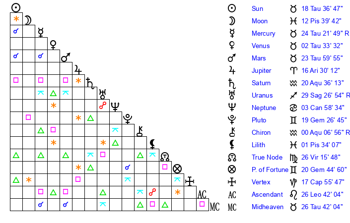 | Sun | 18 Taurus 37 | 19 Taurus 19 | 14 Virgo 37 |