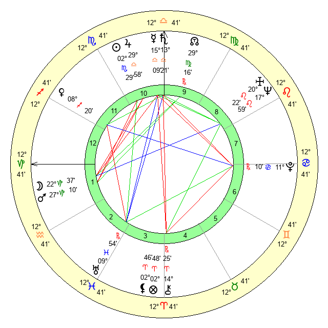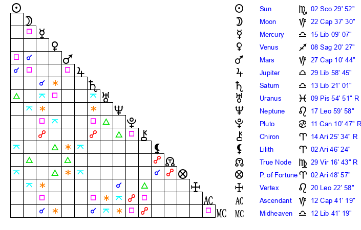 | Saturn | 13 Libra 57 | 25 Pisces 57 | 20 Libra 43 |