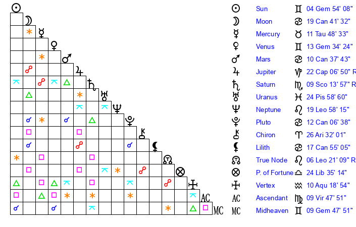 | Mercury | 11 Taurus 49 | 1 Gemini 27 | 26 Leo 18 |