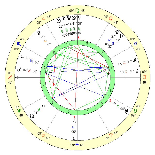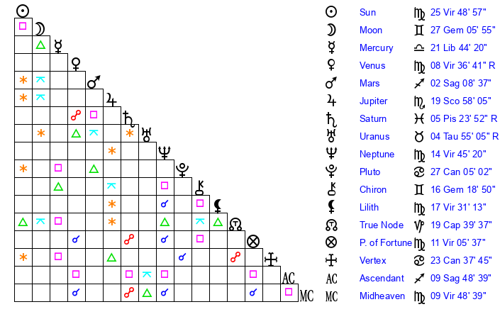 | Sun | 25 Virgo 49 | 27 Virgo 0 | 25 Sagittarius 51 |
