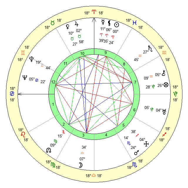 | Sun | 0 Aries 25 | 1 Aries 20 | 26 Cancer 19 |