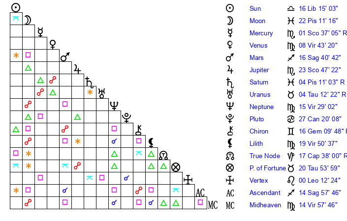 | Mars | 16 Sagittarius 40 | 12 Scorpio 23 | 25 Aquarius 14 |