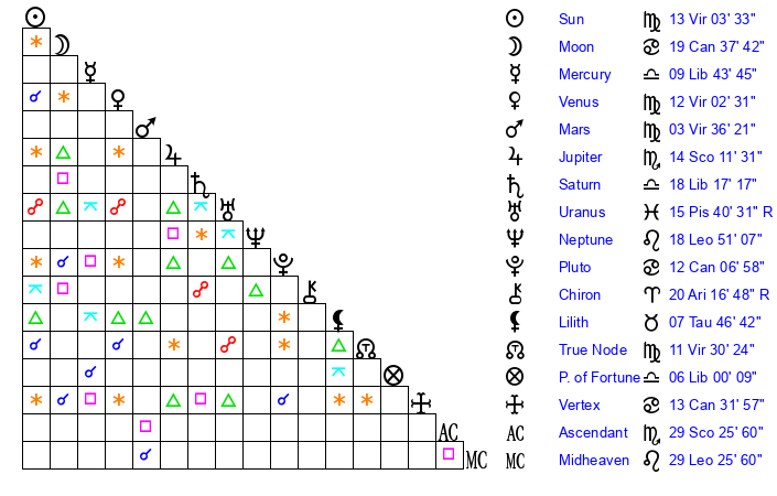 | Sun | 13 Virgo 4 | 14 Virgo 21 | 24 Sagittarius 45 |