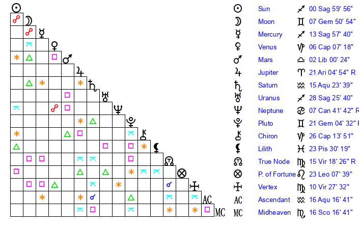 | Mercury | 13 Sagittarius 58 | 24 Scorpio 6 | 17 Aries 20 |