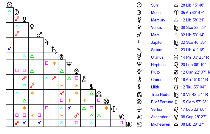 | Neptune | 20 Leo 6 | 29 Pisces 59 | 19 Leo 12 |