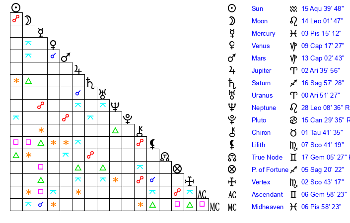 | Mercury | 3 Pisces 15 | 14 Aquarius 22 | 2 Gemini 30 |