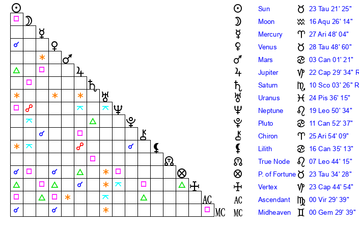 | Uranus | 24 Pisces 36 | 27 Taurus 7 | 24 Pisces 27 |