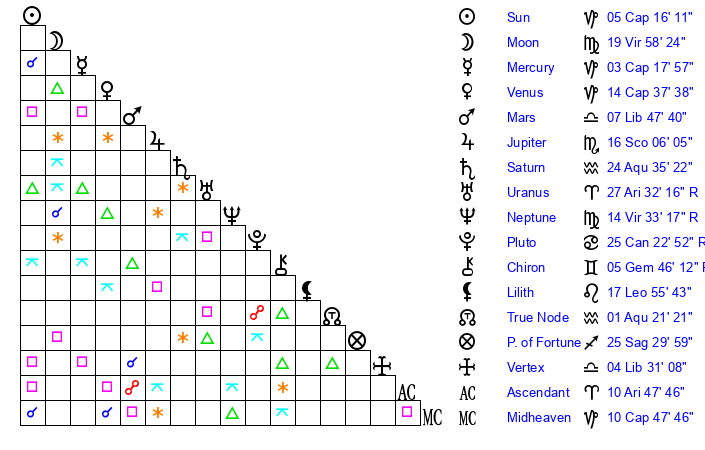 | Neptune | 14 Virgo 32 | 27 Pisces 14 | 12 Virgo 34 |