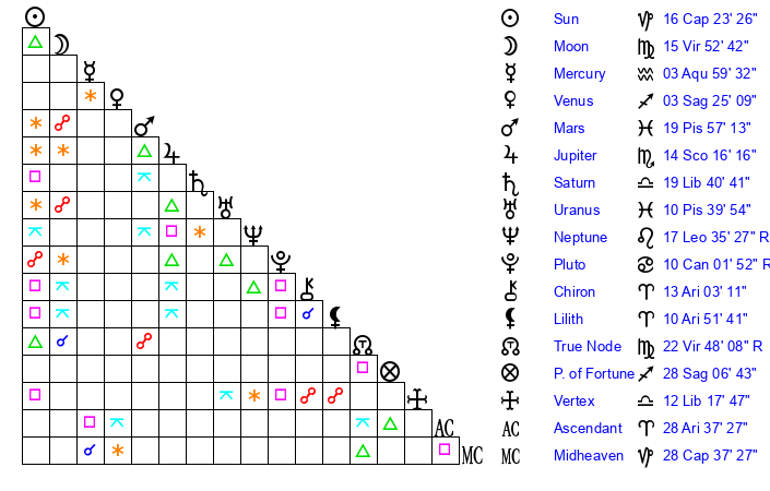 | Sun | 16 Capricorn 23 | 17 Capricorn 39 | 28 Aries 36 |