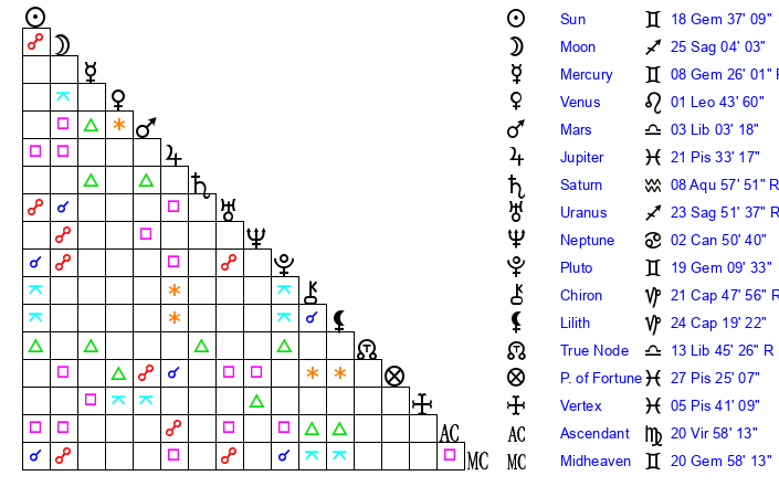 | Pluto | 19 Gemini 10 | 3 Aquarius 30 | 20 Gemini 39 |