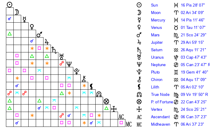 | Sun | 16 Pisces 28 | 17 Pisces 22 | 12 Cancer 58 |
