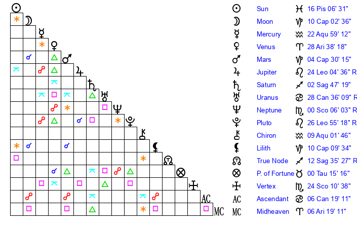 | Sun | 16 Pisces 6 | 16 Pisces 22 | 23 Taurus 51 |