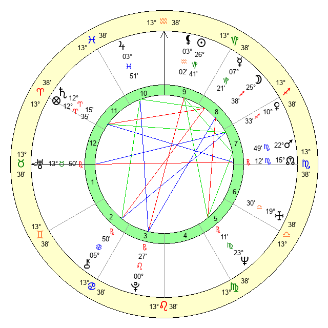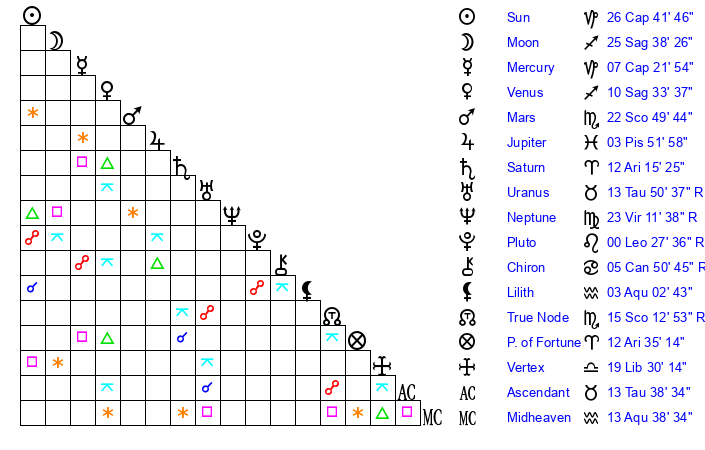| Moon | 25 Sagittarius 32 | 12 Virgo 30 | 14 Aquarius 55 |