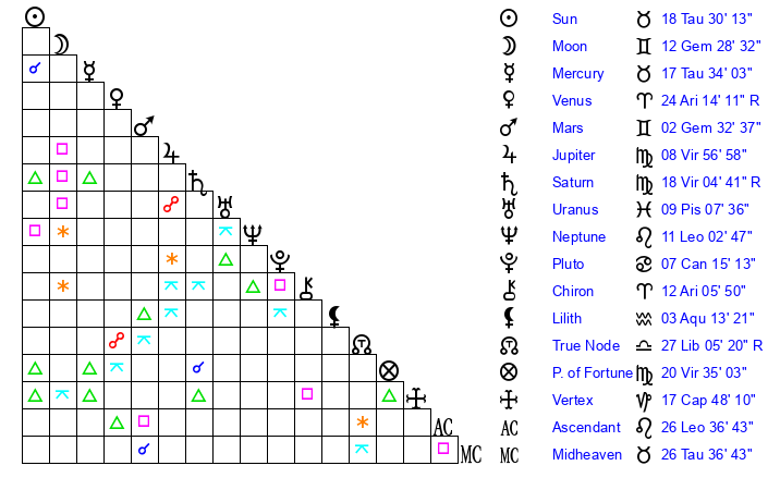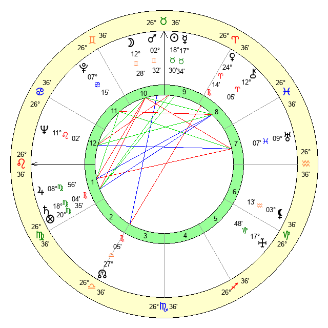 | Sun | 18 Taurus 30 | 19 Taurus 19 | 28 Leo 4 |