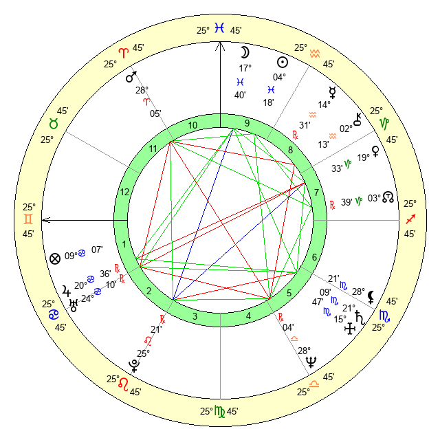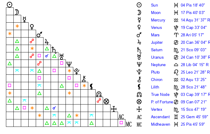 | Moon | 17 Pisces 40 | 9 Capricorn 27 | 18 Libra 42 |