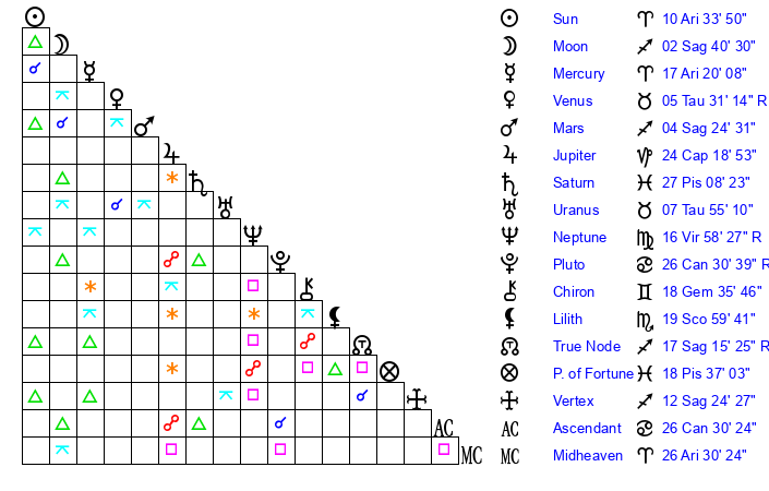 | Pluto | 26 Cancer 30 | 3 Aquarius 32 | 27 Cancer 40 |