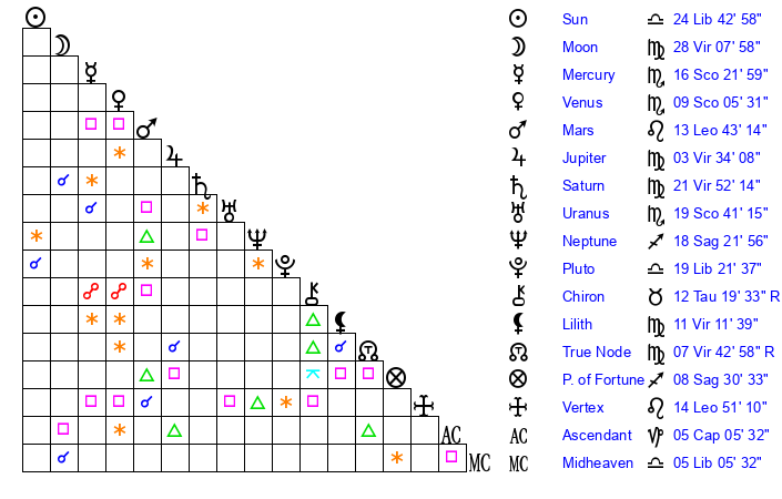 | Moon | 28 Virgo 11 | 24 Virgo 15 | 10 Gemini 19 |