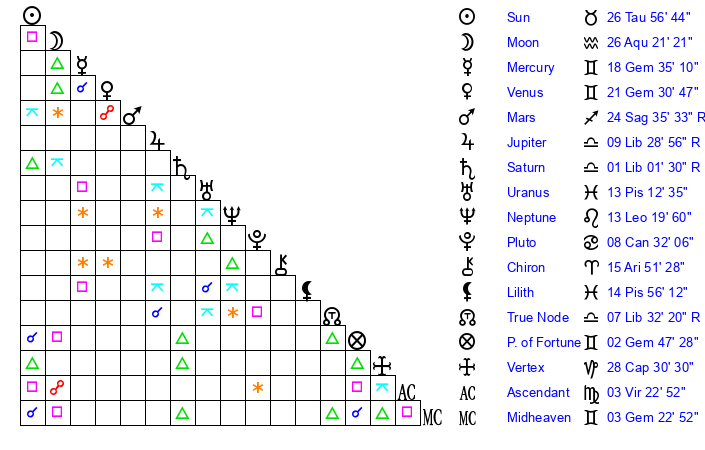 | Moon | 26 Aquarius 21 | 6 Aquarius 4 | 8 Sagittarius 16 |