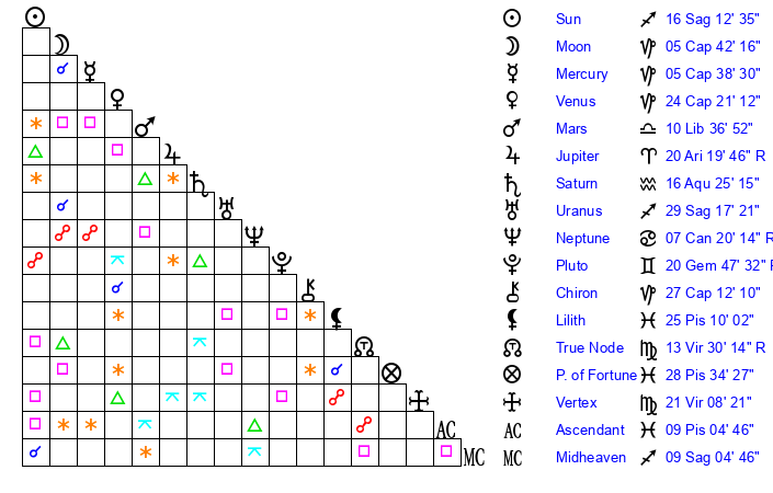 | Saturn | 16 Aquarius 52 | 25 Pisces 10 | 0 Pisces 0 |