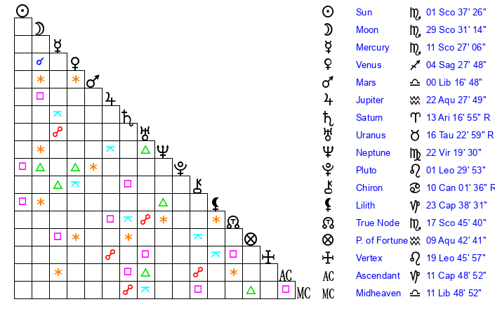 | Moon | 29 Scorpio 30 | 18 Sagittarius 11 | 1 Aquarius 19 |