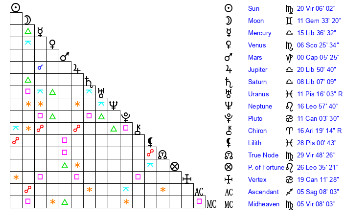 | Sun | 20 Virgo 6 | 21 Virgo 9 | 3 Capricorn 8 |