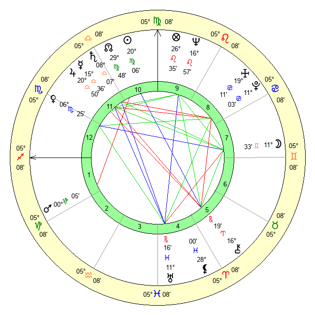 | Venus | 6 Scorpio 25 | 22 Leo 55 | 26 Scorpio 23 |