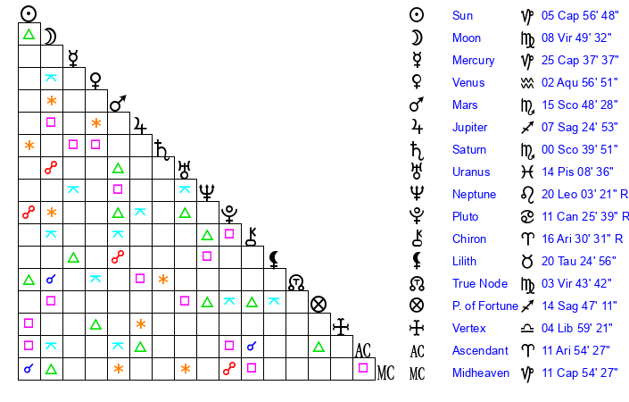 | Sun | 5 Capricorn 57 | 7 Capricorn 13 | 18 Aries 35 |