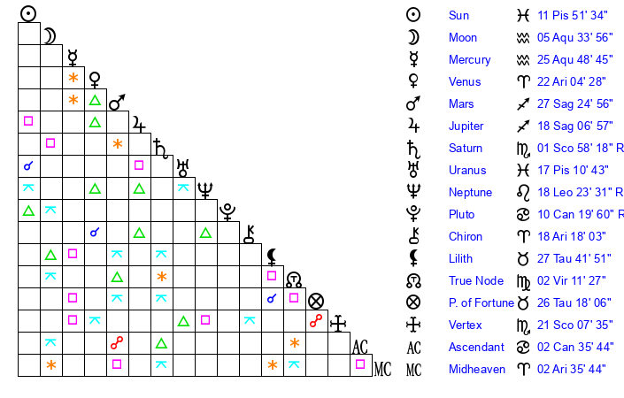 | Sun | 11 Pisces 51 | 12 Pisces 22 | 20 Gemini 27 |
