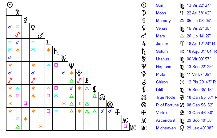 | Sun | 13 Virgo 23 | 14 Virgo 21 | 14 Scorpio 34 |