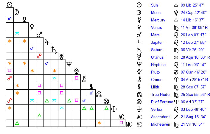 | Moon | 24 Capricorn 39 | 24 Aquarius 48 | 17 Sagittarius 16 |