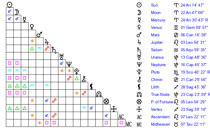 | Moon | 22 Aries 46 | 13 Scorpio 18 | 29 Cancer 43 |