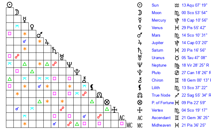 | Moon | 0 Scorpio 53 | 4 Aries 34 | 12 Capricorn 53 |