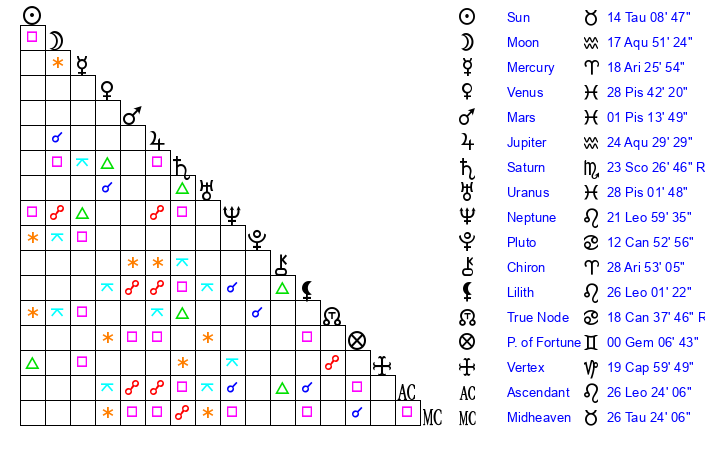 | Neptune | 21 Leo 59 | 1 Aries 13 | 24 Leo 18 |
