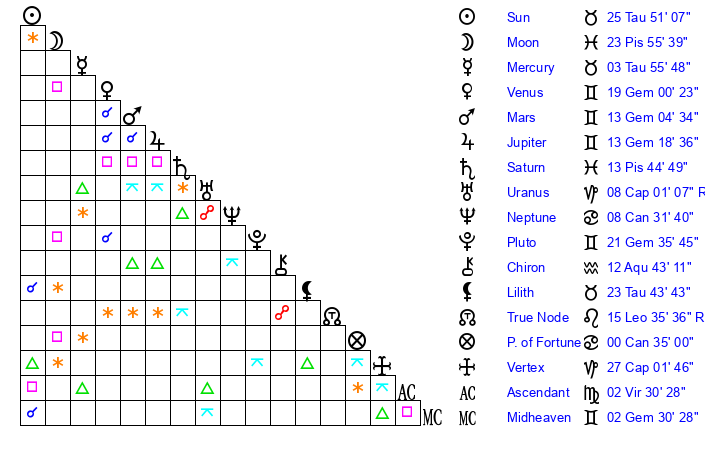 | Pluto | 21 Gemini 36 | 3 Aquarius 46 | 23 Gemini 45 |