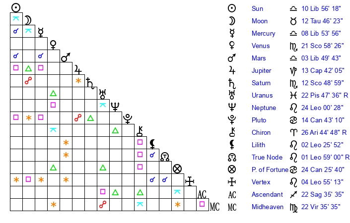 | Sun | 10 Libra 57 | 11 Libra 43 | 21 Capricorn 46 |