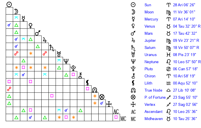 | Sun | 28 Aries 6 | 28 Aries 54 | 7 Leo 54 |