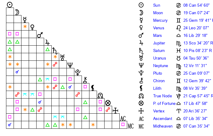| Moon | 18 Cancer 59 | 27 Virgo 56 | 27 Libra 32 |