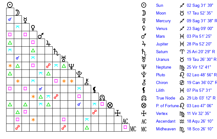| Moon | 17 Taurus 55 | 3 Aquarius 30 | 8 Cancer 51 |