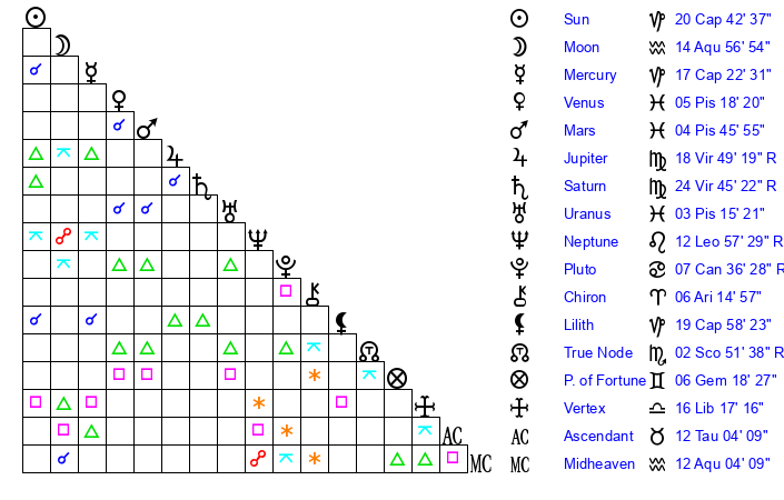 | Moon | 15 Aquarius 0 | 19 Gemini 58 | 12 Sagittarius 11 |