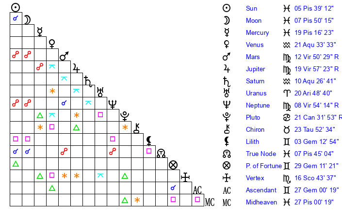 | Mercury | 19 Pisces 16 | 18 Pisces 51 | 4 Gemini 36 |