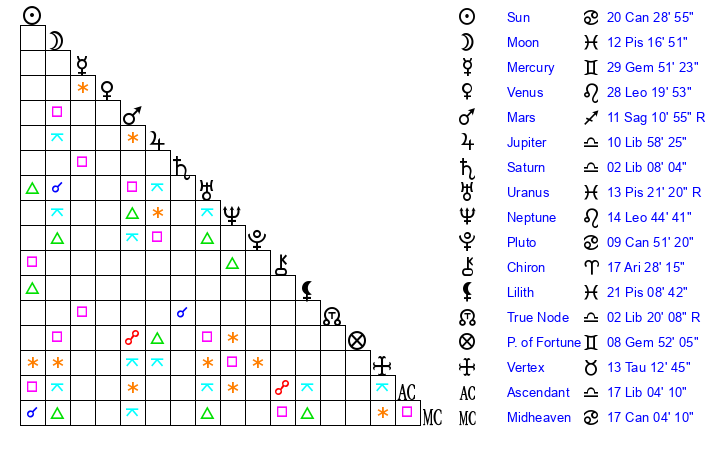 | Venus | 28 Leo 20 | 10 Gemini 5 | 7 Sagittarius 37 |