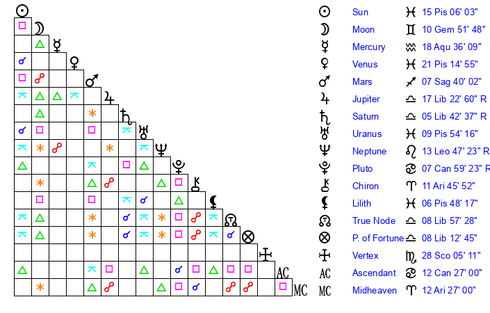 | Moon | 10 Gemini 50 | 13 Gemini 11 | 24 Pisces 53 |