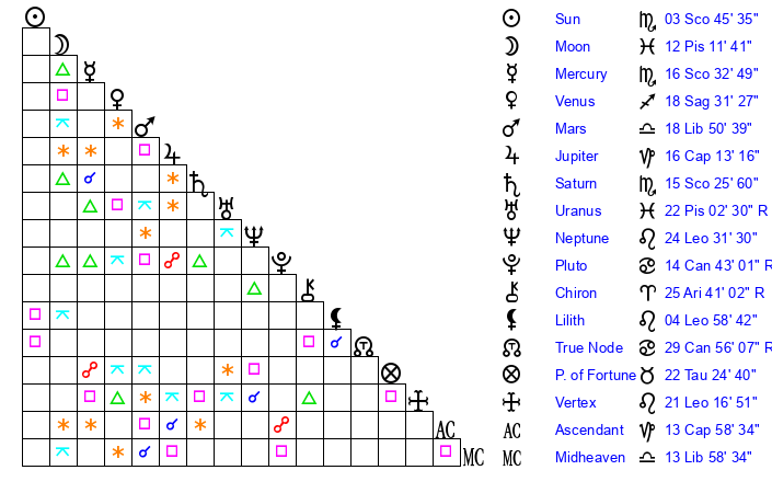 | Moon | 12 Pisces 13 | 12 Capricorn 8 | 0 Scorpio 6 |