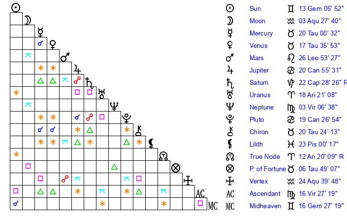 | Sun | 13 Gemini 6 | 14 Gemini 19 | 13 Virgo 7 |