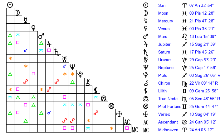 | Sun | 7 Aries 32 | 8 Aries 16 | 6 Taurus 58 |